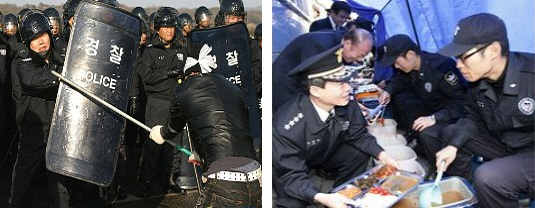 전의경은 찌는 더위에 바람 한점 통하지 않는 진압복을 입고 몸싸움에 녹초가 되곤 했다. 또 다리조차 펴기 힘든 좁은 버스좌석에 지친 몸을 의탁하거나 행인의 불편한 시선을 느끼며 줄지어 초라한 급식을 받고 있었다.