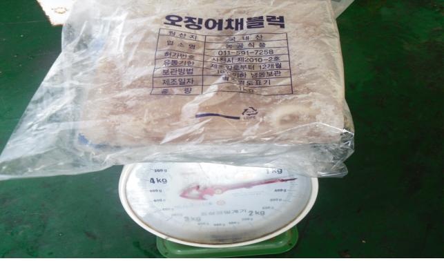 경남 사천시 소재 ‘남해수산’ 대표 박모씨(남, 52세)는 오징어채 블럭 실중량 700g짜리 제품을 가수량 포함한 중량 1kg으로 허위 표시하여 168kg을 보관 중 적발됐다.