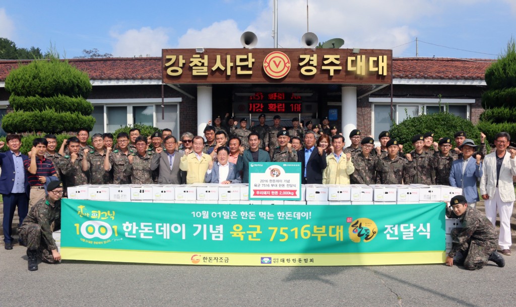 (사)대한한돈협회 경북도협의회(회장 최재철)는 27일 돼지고기 2,000kg (1,000만원 상당)을 육군 제7515부대 1대대에 전달했다.