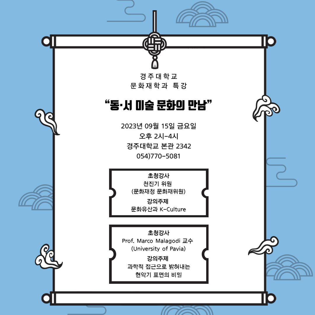 경주대학교 대학원 문화재학과는 9월 15일(금)에 경주대학교에서 “동·서 미술문화의 만남”을 주제로 특강을 진행한다. 이번 특강은 천진기 문화재청 문화재위원(이하 위원)과 파비아 대학교(University of Pavia)에 재직중인 마르코 말라고디(Marco Malagodi) 교수가 초청되었다.